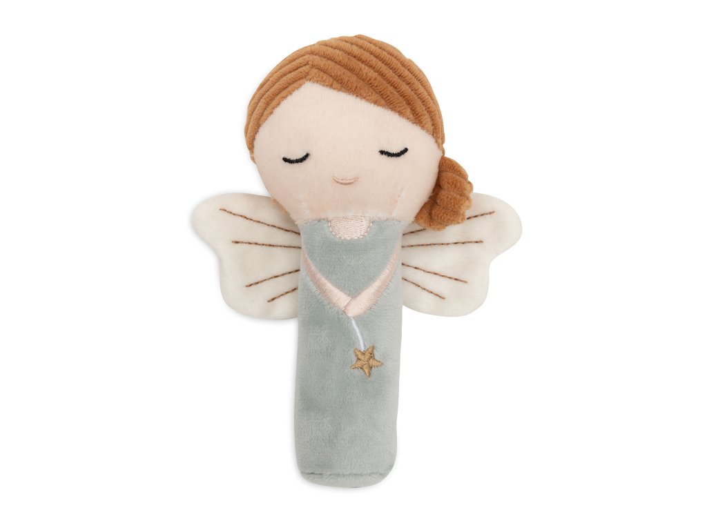 Chrastítko v podobě něžné víly z měkkého textilního materiálu má tvar pro snadné uchopení a při pohybu jemně chrastí.