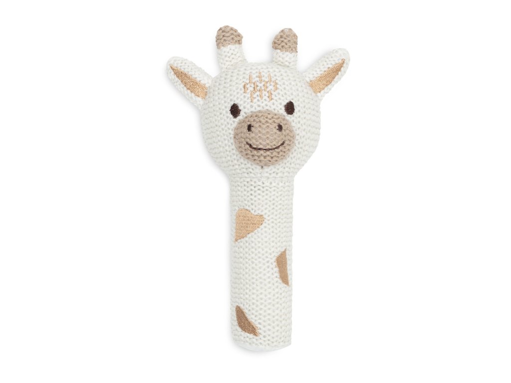 Chrastítko v podobě žirafy z měkkého bavlněného materiálu má tvar pro snadné uchopení a při pohybu jemně chrastí.