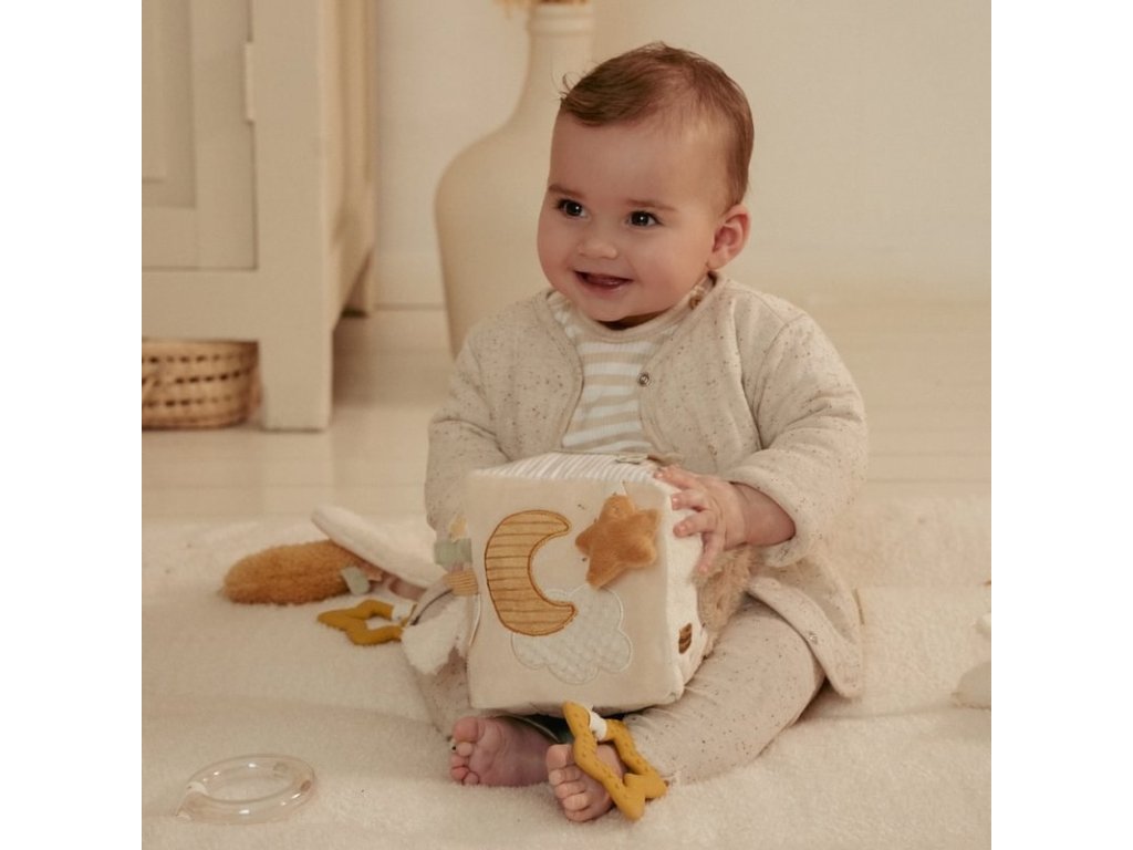 Měkká plyšová kostka s krásnými motivy ze života husy a králíčka je díky svému provedení snadno uchopitelná malými dětskými ručičkami. Různorodé textury, připevněné hračky a vyšívané ilustrace lákají dítě ke zkoumání, kostka navíc při pohybu jemně cinká.